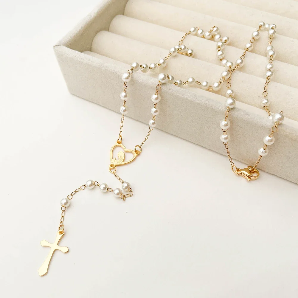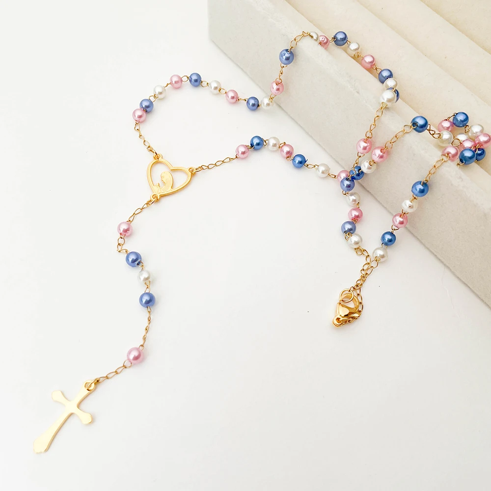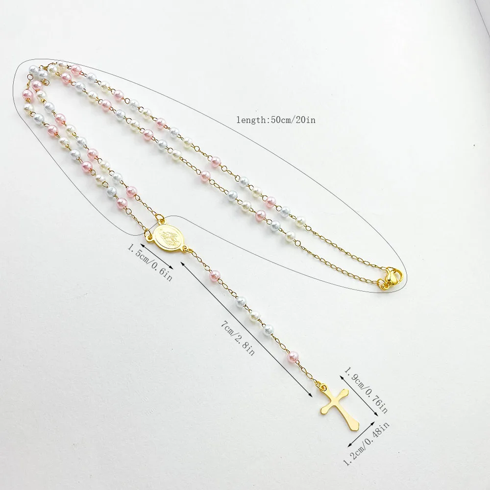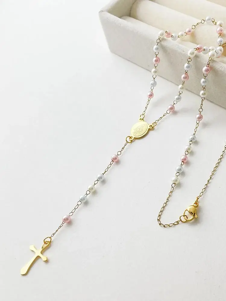 Y Shape Beads Chain Gold Color Stainless Steel Virgin Mary Cross Rosary Pendant Long Necklace Women Girls Jewelry Spiriti Pray